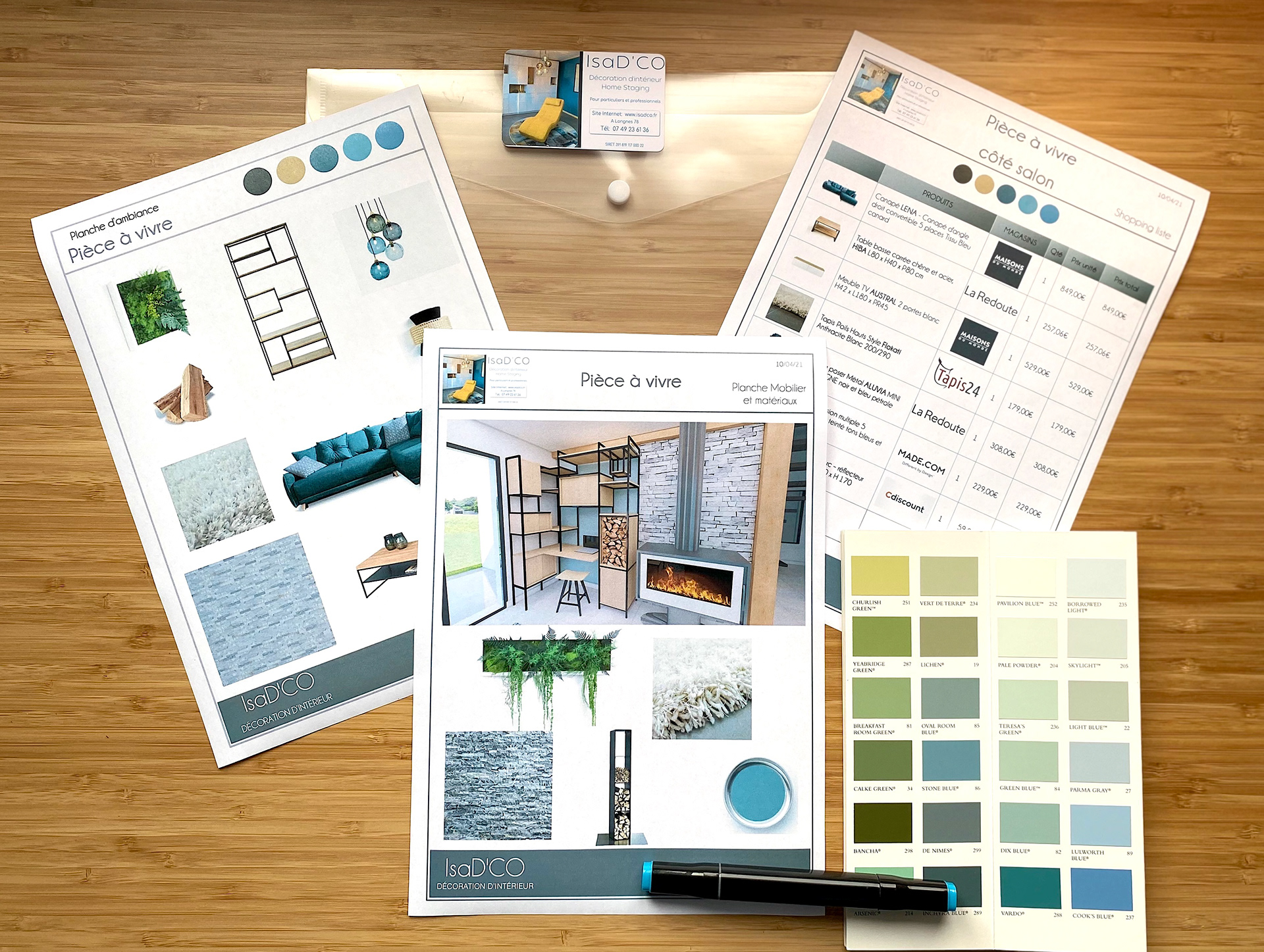 Votre projet Déco vous est remis dans une pochette contenant planches d'ambiances, planches mobilier et matériaux, shopping listes, plans de coupes...